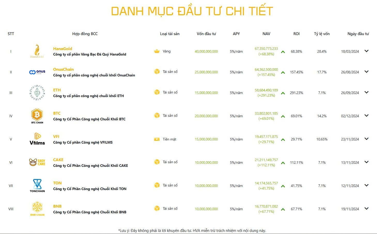 Ngoài ra, HVA còn đầu tư vào các công ty blockchain khác là BNB, TON và CAKE. Nhà đầu tư có thể xem chi tiết danh mục ở ảnh dưới hoặc cập nhật danh mục đầu tư của HVA tại web: https://hva.group/dau-tu-tai-san-so/.