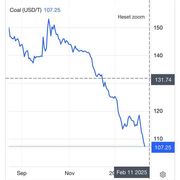 coal futures fell to $107 per tonne in February, the lowest in nearly four years, as data points to an increasingly oversupplied market. China announced that its output is set to expand 1.5% to 4.82 billion tons in 2025 following a record-setting 2024, aiming to expand mining capacity to avoid availability risks from carbon emission limits and mine shutdowns for safety protocol breaches.