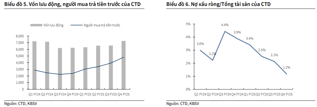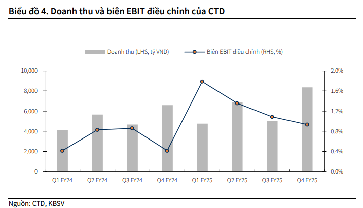 - Bên cạnh đó, Ban lãnh đạo cũng đặt mục tiêu không phát sinh chi phí dự phòng trong 2026 trong bối cảnh thị trường Bất động sản dần bước vào pha tăng trưởng trong thời gian tới. Ước tính biên EBIT của CTD đạt lần lượt 1.6%/1.8% (tăng 27/23 bps so với cùng kỳ, đã loại bỏ tác động từ việc hoàn nhập chi phí dự phòng liên quan tới Saigon Glory trong Q4 FY25).