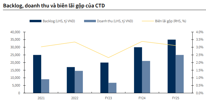 Dự phóng giá trị hợp đồng ký mới của CTD đạt 35,000/38,000 tỷ VND trong FY26/FY27, doanh thu đạt lần lượt 29,760/32,480 tỷ VND (+20%/9% YoY).