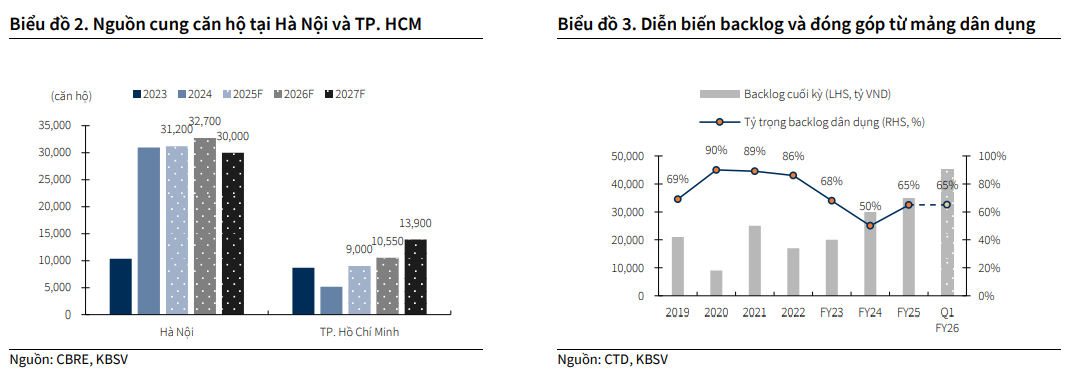 - Thị trường Bất động sản hồi phục giúp hoạt động xây dựng dần khởi sắc trở lại từ đầu năm tới nay đã giúp backlog của CTD đạt hơn 35,000 tỷ VND vào cuối 2Q2025 (tức FY25 của doanh nghiệp) và ước tính đạt 45,000 – 50,000 tỷ VND tại 3Q2025 (tương ứng 1.8x doanh thu FY24). Chúng tôi kỳ vọng backlog mảng dân dụng sẽ tiếp tục cải thiện trong 2026 – 2027, đặc biệt tại thị trường miền Nam khi nguồn cung căn hộ được dự phóng tăng lần lượt 17%/32% YoY.