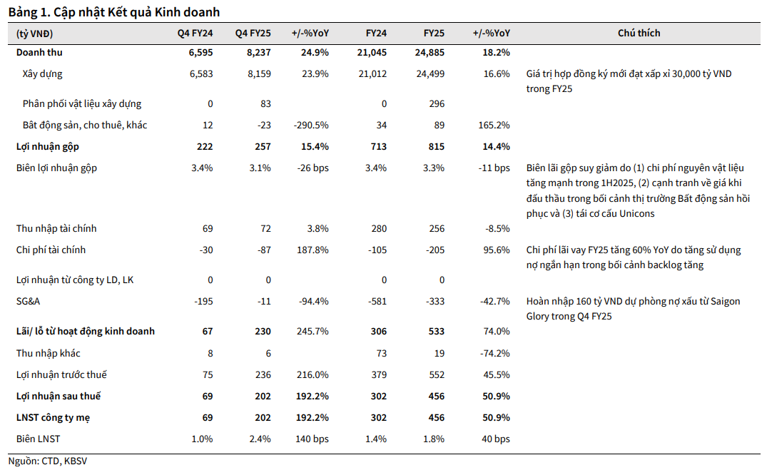 - CTD ghi nhận doanh thu và LNST đạt lần lượt 24,867/454 tỷ VND (tăng 18%/47% YoY). Kết quả trên được hỗ trợ nhờ hoàn nhập 160 tỷ VND chi phí dự phòng nợ xấu liên quan tới Saigon Glory trong Q4 FY25. Biên lãi gộp của CTD trong FY25 đạt 3.1%, thấp hơn so với kế hoạch ban đầu do (1) chi phí nguyên vật liệu tăng trong 1H2025, (2) cạnh tranh trong ngành gia tăng khi thị trường Bất động sản hồi phục, (3) tái cơ cấu Unicons.
