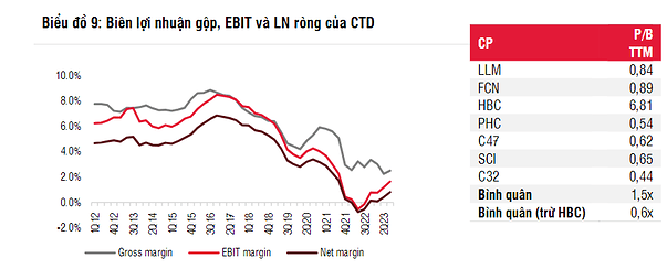 Về khả năng sinh lời, CTD đạt biên lợi nhuận gộp là 2,4% và biên lợi nhuận trước thuế là 2,1% trong Q1/FY2024, có sự cải thiện đáng kể so với năm trước. Mặc dù biên lợi nhuận gộp thấp hơn, biên lợi nhuận trước thuế của CTD được đánh giá tích cực khi so sánh với các công ty xây dựng trong nước khác. Điều này có thể được giải thích bằng chi phí tài chính thấp do hệ số đòn bẩy của công ty ở mức thấp và số dư nợ tại mức 1,13 nghìn tỷ đồng, thấp hơn số dư tiền mặt là 2,5 nghìn tỷ đồng.