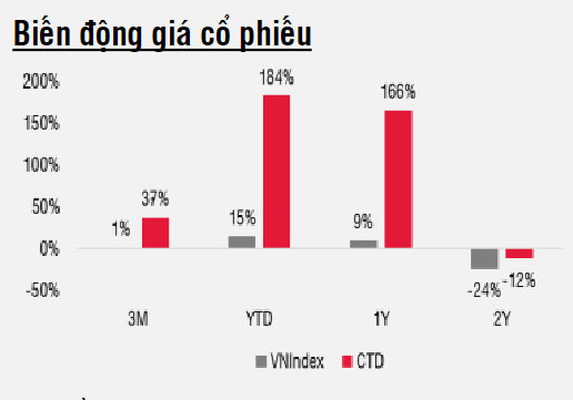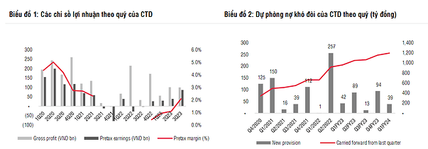CTD đã hoàn thành 31% kế hoạch lợi nhuận trước thuế cho cả năm, với sự hỗ trợ từ dự án LEGO có giá trị hợp đồng 10 nghìn tỷ đồng. Trong quý, CTD còn ghi nhận mức tăng trưởng mạnh về LNTT, chủ yếu do giảm chi phí dự phòng nợ khó đòi, với việc phân bổ 39 tỷ đồng (giảm 7% so với quý trước).