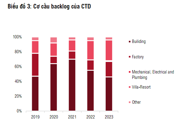 Doanh nghiệp CTD - CTCP Xây dựng COTECCONS thể hiện tiềm năng phục hồi mạnh mẽ trong năm 2024 dưới những điều kiện thách thức. Điều này được chứng minh qua tăng trưởng ấn tượng của backlog trong Q1/FY2024, đạt 24 nghìn tỷ đồng, tăng 20% so với đầu niên độ tài chính cuối tháng 6/2023. Mảng xây dựng dân dụng chiếm 40% backlog và mảng xây dựng công nghiệp chiếm khoảng 20%.