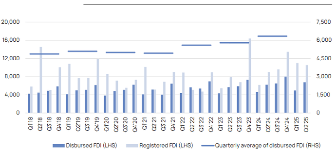 Từ ngày 07/08/2025, Mỹ chính thức áp thuế đối ứng với hầu hết các đối tác thương mại của mình, dao động từ 10-14%. Đối với Việt Nam, con số được đưa ra là 20% - một con số theo chúng tôi là tích cực trong bối cảnh thâm hụt thương mại cao, và các nước đối thủ của chúng ta đang chịu mức thuế tương đương hoặc cao hơn. Mức thuế mới này vẫn hứa hẹn các nhà đầu tư có thể tiếp tục có kế hoạch dài hạn ở Việt Nam, cũng như củng cố triển vọng tích cực của chúng tôi về sức hấp dẫn FDI của Việt Nam.