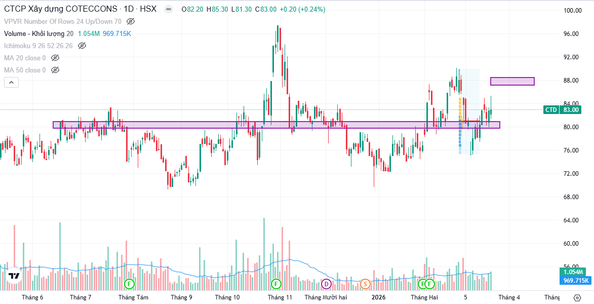 Hỗ trợ ngắn hạn của CTD ở vùng 80.x, kỳ vọng target ngắn hạn quay lại vùng kháng cự 88.x.