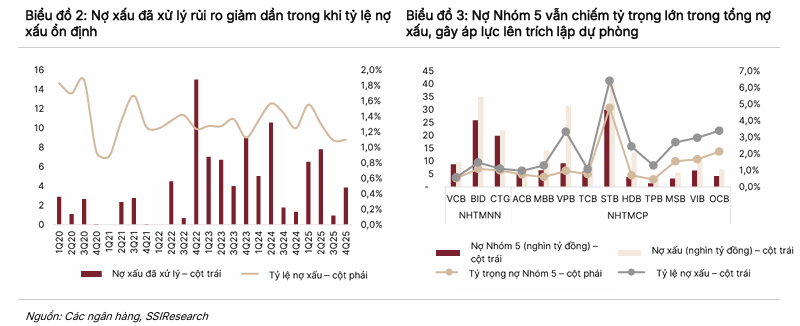 Ở chiều ngược lại, SSI cho rằng mặt bằng lãi suất tăng có thể ảnh hưởng đến khả năng trả nợ của khách hàng, khiến tỷ lệ nợ xấu của CTG tăng lên khoảng 1,2% trong năm 2026. Theo đó, chi phí dự phòng dự kiến khoảng 19.000 tỷ đồng, với tỷ lệ bao phủ nợ xấu khoảng 132%.