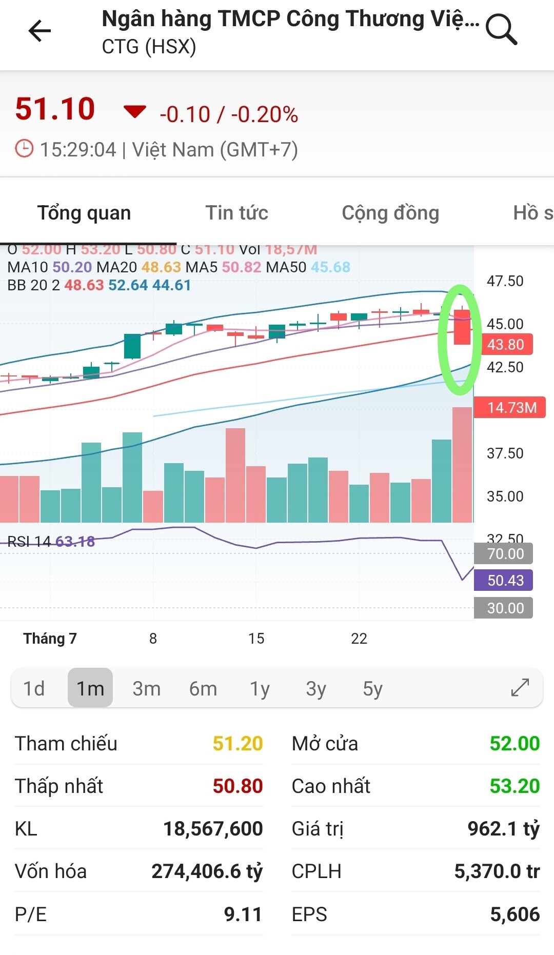 Tóm lại: Cây nến hôm nay của CTG là một tín hiệu tiêu cực, phản ánh áp lực bán mạnh khi giá tiếp cận kháng cự. Hướng đi tiếp theo phụ thuộc việc CTG giữ được mốc 51 hay không trong những phiên tới.