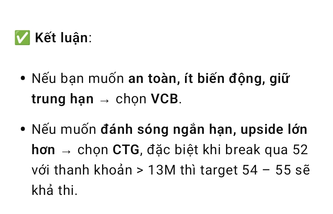 Tóm lại: CTG đang tích lũy quanh vùng 50, khá cân bằng. Chiến lược phù hợp là gom dần quanh 49.5 – 50.0, đặt stoploss 48.5, kỳ vọng chốt lãi ngắn hạn ở 52 – 52.5. Nếu có bứt phá với vol lớn thì có thể nắm giữ dài hơn.