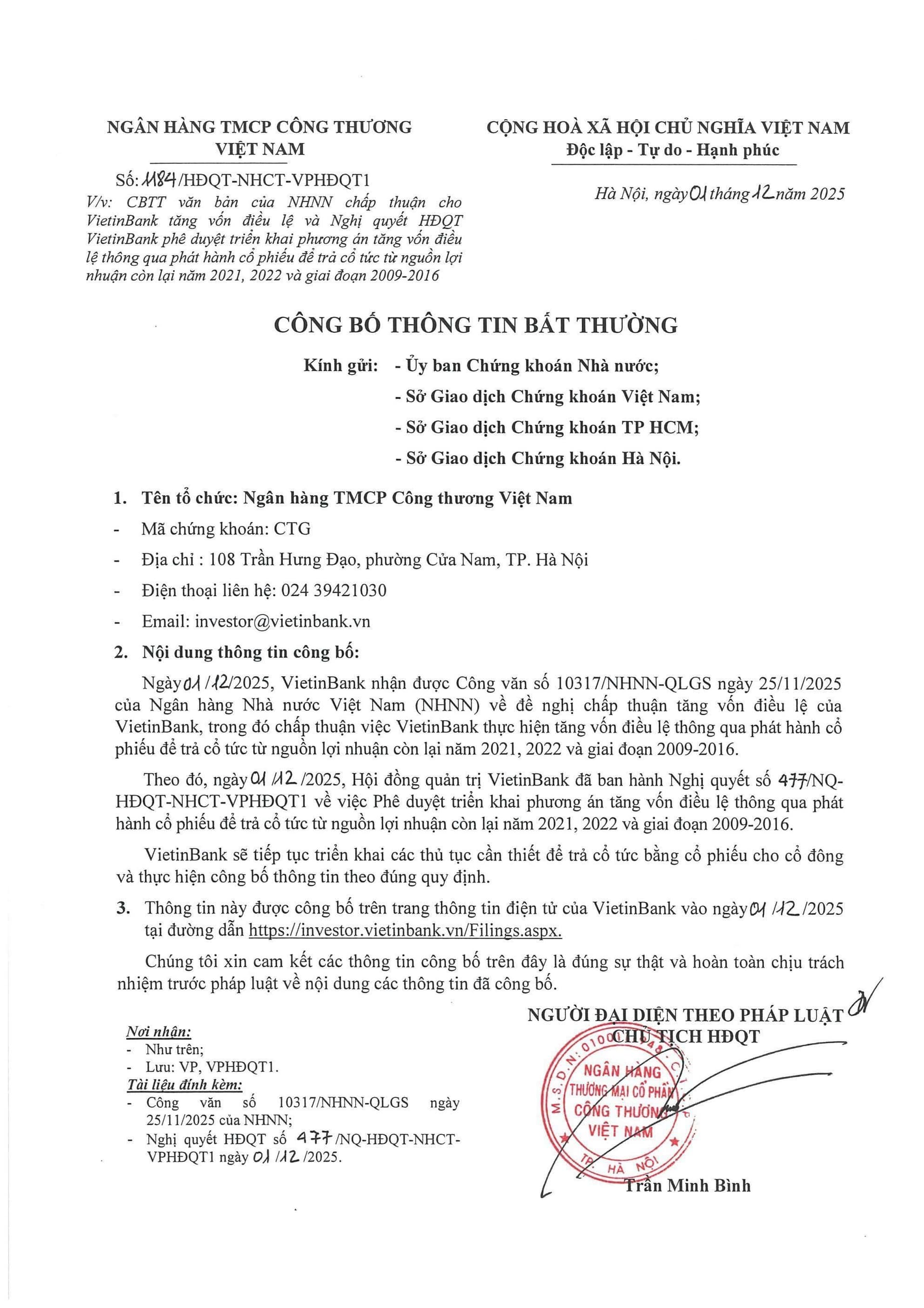 CTG ghi nhận kết quả kinh doanh tích cực trong 9 tháng đầu năm 2024 với thu nhập hoạt động đạt 60.624 tỷ đồng (+16,2% so với cùng kỳ) và lợi nhuận trước thuế đạt 19.513 tỷ đồng (+12,1%). Tăng trưởng tín dụng đạt 9%, trong đó mảng bán lẻ tăng mạnh 11,9% và doanh nghiệp FDI tăng 18,5%. Tỷ lệ chi phí trên thu nhập (CIR) ở mức thấp 27,8%, cho thấy hiệu quả hoạt động được cải thiện. Tỷ lệ nợ xấu (NPL) giảm xuống 1,45% và tỷ lệ bao phủ nợ xấu (LLCR) đạt 153% – cao thứ hai ngành – phản ánh năng lực quản trị rủi ro vững chắc. Dự án lớn sắp tới là việc tăng vốn điều lệ lên khoảng 74.200 tỷ đồng (tăng 38% so với cuối 2023) thông qua chia cổ tức bằng cổ phiếu, nhằm nâng cao tỷ lệ an toàn vốn (CAR) vốn đang ở mức thấp 9,5% so với các ngân hàng nhà nước khác.