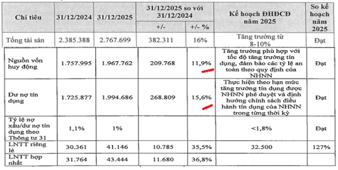 Tổng tài sản: Mục tiêu vượt mốc 2,76 triệu tỷ đồng, tăng trưởng 16% so với cuối năm 2024. Đây là nền tảng để ngân hàng mở rộng quy mô hoạt động.