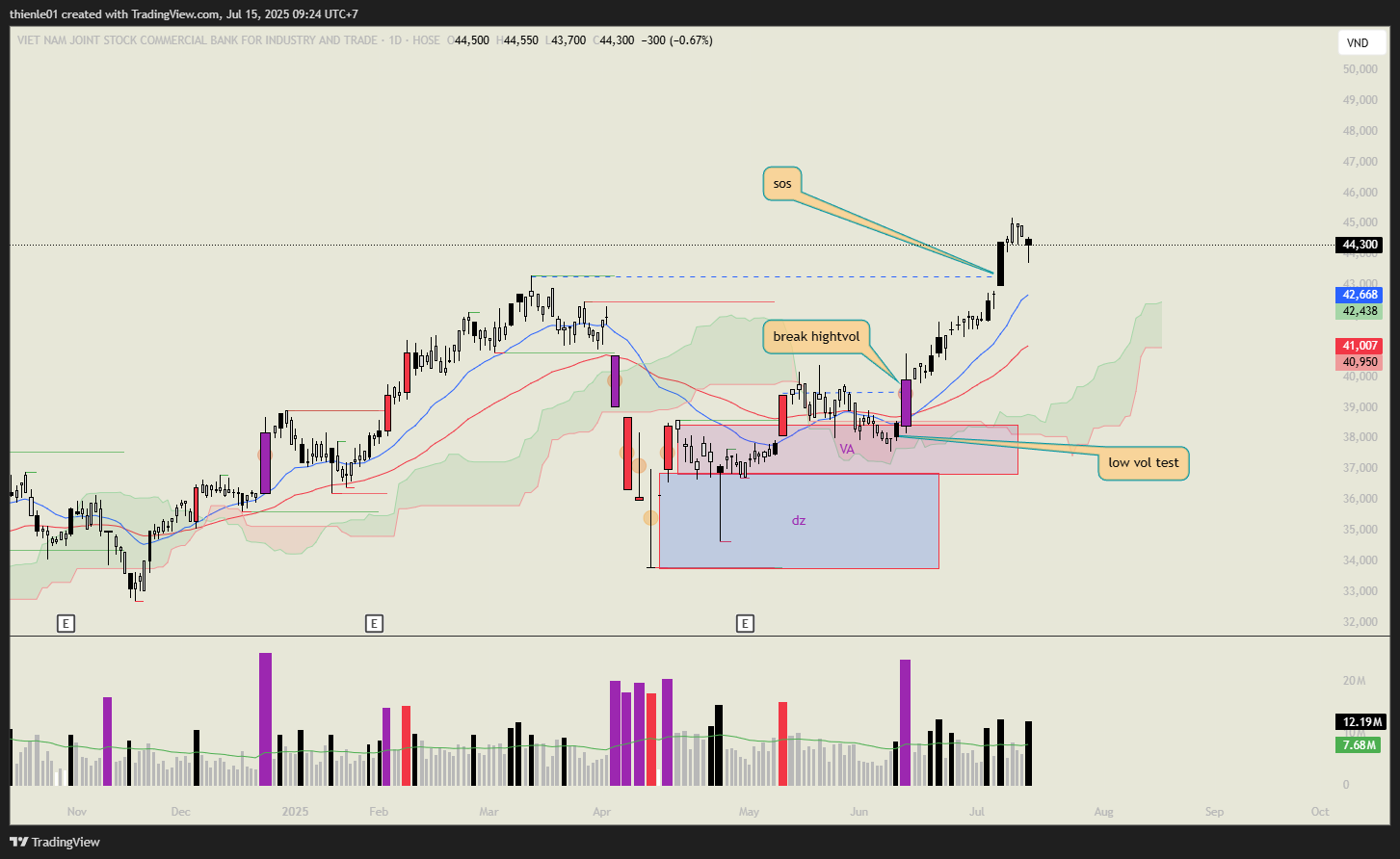 CTG đang tiến dần về vùng Unfair High (UFH) – là vùng đỉnh cũ màu vàng mà trước đó thị trường đã từng từ chối. Đây là nơi mà bên bán từng phản ứng mạnh, nên việc giá quay lại là một cuộc kiểm định đấu giá quan trọng.