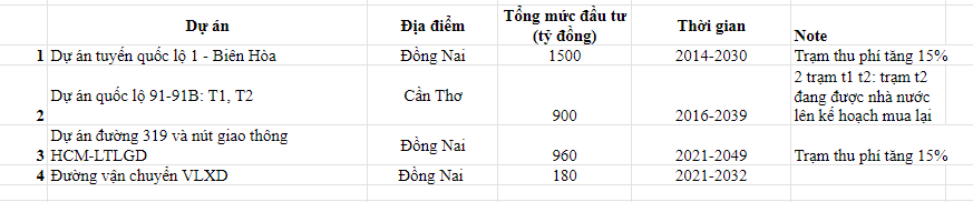 - Chỉ có dự án tuyến quốc lộ 1 - Biên Hòa không tăng trưởng mà giảm 10% do bị ảnh hưởng từ đường cao tốc HCM Long Thành được triển khai.