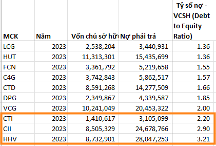 - CTI đang đi vay gấp đôi vốn chủ sở hữu. Nhưng những doanh nghiệp có các dự án đầu tư BOT như CTI CII, HHV đều sử dụng lượng lớn đòn bẩy và có tỷ số Nợ/VCSH cao so với các công ty khác trong cùng ngành đầu tư công.