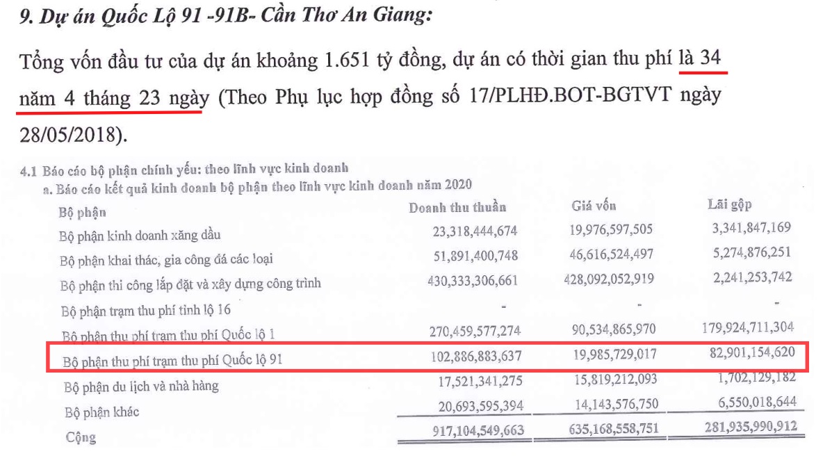 Trạm thu phí BOT QL91: 103 tỷ/năm, lãi gộp 83 tỷ/năm thời hạn thu 34 năm đến T8/2040. Dự kiến từ 2022 sẽ tăng trưởng tốt sau khi hồi phục do ảnh hưởng covid, QL91 là tuyến gần như độc đạot từ TP Cần Thơ về các tỉnh Kiên Giang, Đồng Tháp, An Giang …