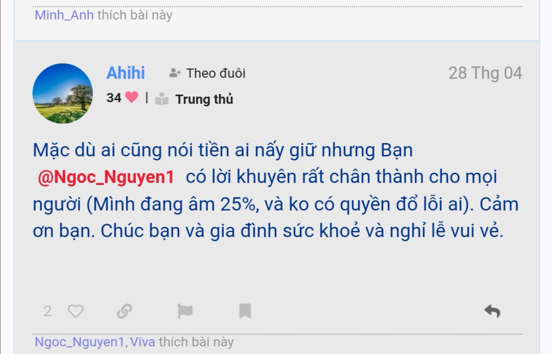 Mặc dù Em lỗ nhưng đầu tư là do chính mình, mình F0 chưa biết đánh giá. Kể cả Bác nào nói là lùa gà hay úp bô gì đó giúp đỡ F0 thì cũng đừng dùng tục tĩu quá. Trên diễn đàn còn có các cháu nhỏ cũng vừa tham gia ạ. Cảm ơn các cụ đã theo dõi.