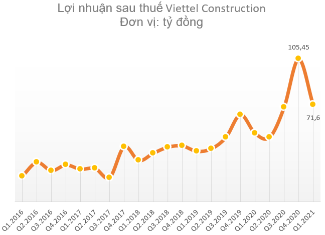 Trong quý 1/2021, Viettel Construction đạt doanh thu thuần 1.750 tỷ đồng và lợi nhuận sau thuế 71,6 tỷ đồng, tăng trưởng lần lượt 27% và 41% so với cùng kỳ năm trước.