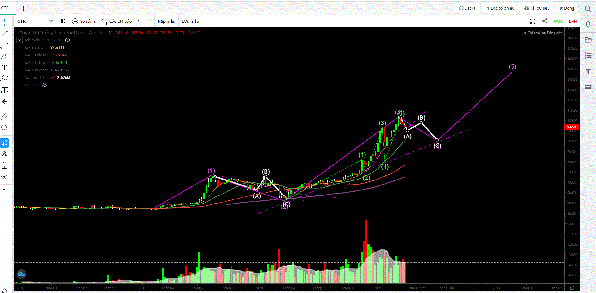 CTR đi sóng 1 đẹp, sóng chỉnh 2 đẹp và khá phũ, đồng pha với VNINDEx nhưng chỉnh sâu hơn, sóng 3 mạnh, vượt VNINDEX rất nhiều