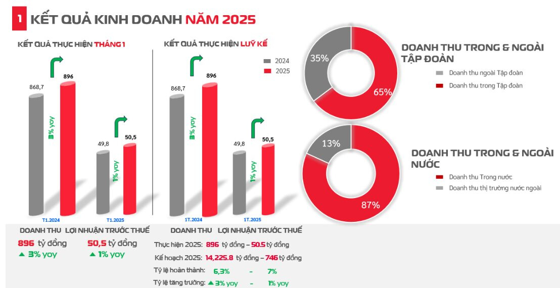 Trong tháng đầu năm, các mảng hoạt động chính của Viettel Construction ghi nhận tăng trưởng ở mức thấp so với cùng kỳ. Tuy nhiên, mảng hạ tầng cho thuê vẫn đạt mức tăng trưởng vượt trội 43%, mang về gần 64 tỷ đồng. Tại các mảng hoạt động, lĩnh vực vận hành khai thác (VHKT) dù đóng góp lớn nhất vào doanh thu nhưng mức tăng gần như đi ngang so với cùng kỳ 2024, đạt hơn 456 tỷ đồng. Công ty duy trì tốt chất lượng VHKT, đảm bảo tài nguyên mạng lưới, phục vụ Tết Âm lịch và các sự kiện lễ hội đầu năm.
