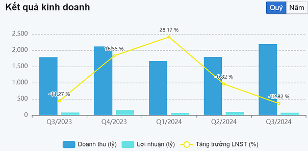 Doanh thu thuần Q3/2024: Đạt 2.188 tỷ đồng, tăng 23% so với cùng kỳ năm trước.