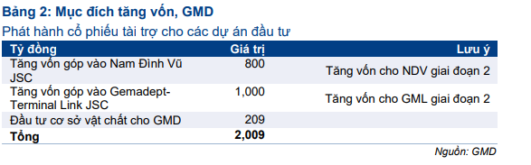 Phát hành quyền chọn để hỗ trợ mở rộng công suất GMD đề xuất phát hành quyền chọn trong năm 2022 cho cổ đông hiện hữu với tỷ lệ 1:3 (3 cổ phiếu hiện tại sẽ được quyền mua một cổ phiếu mới). Giá phát hành là 20.000đ/cp, thấp hơn 66,0% so với thị giá hiện tại. Sau khi phát hành thành công, tổng vốn điều lệ sẽ tăng lên 4.018 tỷ đồng từ mức 3.013 tỷ đồng hiện tại. Bản gốc bằng tiếng Anh của báo cáo này được phát hành vào ngày 5/4