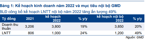 hiện dự báo GML sẽ đóng góp 203 tỷ đồng lợi nhuận cho GMD trong năm 2022 so với khoản lỗ khoảng 30 tỷ đồng trong năm 2021 theo ước tính của chúng tôi. Kế hoạch của Công ty thấp hơn 4,1% so với dự báo LNTT năm 2022 hiện tại của chúng tôi, nhưng kế hoạch nội bộ cao hơn 15% so với dự báo của chúng tôi.