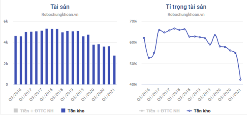 Về nợ vay, từ cuối 2019 đến nay công ty duy trì tỉ lệ nợ vay khá thấp, tại quý 1-2021 tổng nợ vay công ty là 12,284 tỷ chiếm 38% vốn chủ sở hữu và 19.4% tổng tài sản. xu hướng và tỉ lệ nợ vay như hình 4 bên dưới