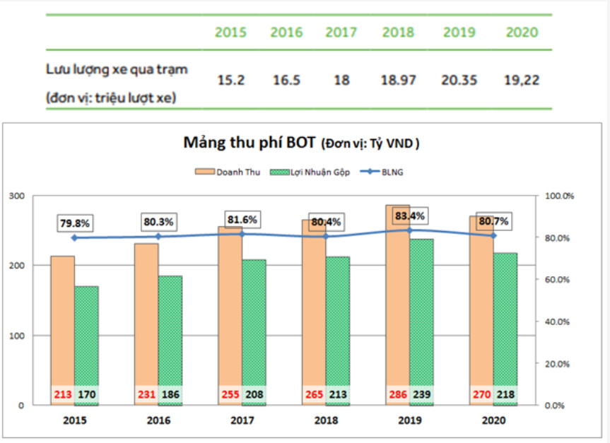 Với việc năm 2021 nhà nước chủ trương vừa chống dịch vừa phát triển kinh tế, sẽ hạn chế tối đa việc giản cách xã hội để đảm bảo kinh tế được vận hành liên tục, chúng tôi cho rằng lưu lượng xe qua trạm năm 2021 sẽ tăng trở lại và có thể đạt con số 22 triệu lượt xe. Trong năm 2021 mảng BOT dự kiến sẽ mang về doanh thu trên 300 tỷ và 250 tỷ lợi nhuận gộp.