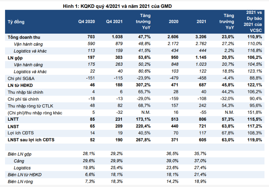 • Tăng trưởng doanh thu của GMD trong quý 4/2021 được thúc đẩy bởi mảng vận hành cảng và logistic với các mức tăng trưởng lần lượt là 49% YoY và 42% YoY.