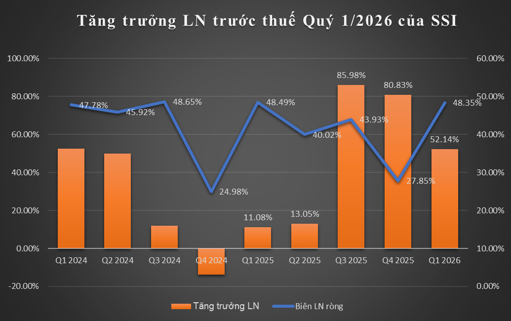 -SSI vừa công bố kết quả kinh doanh quý I/2026 với tổng doanh thu hợp nhất đạt 3.295 tỷ đồng và lợi nhuận trước thuế 1.593 tỷ đồng…**