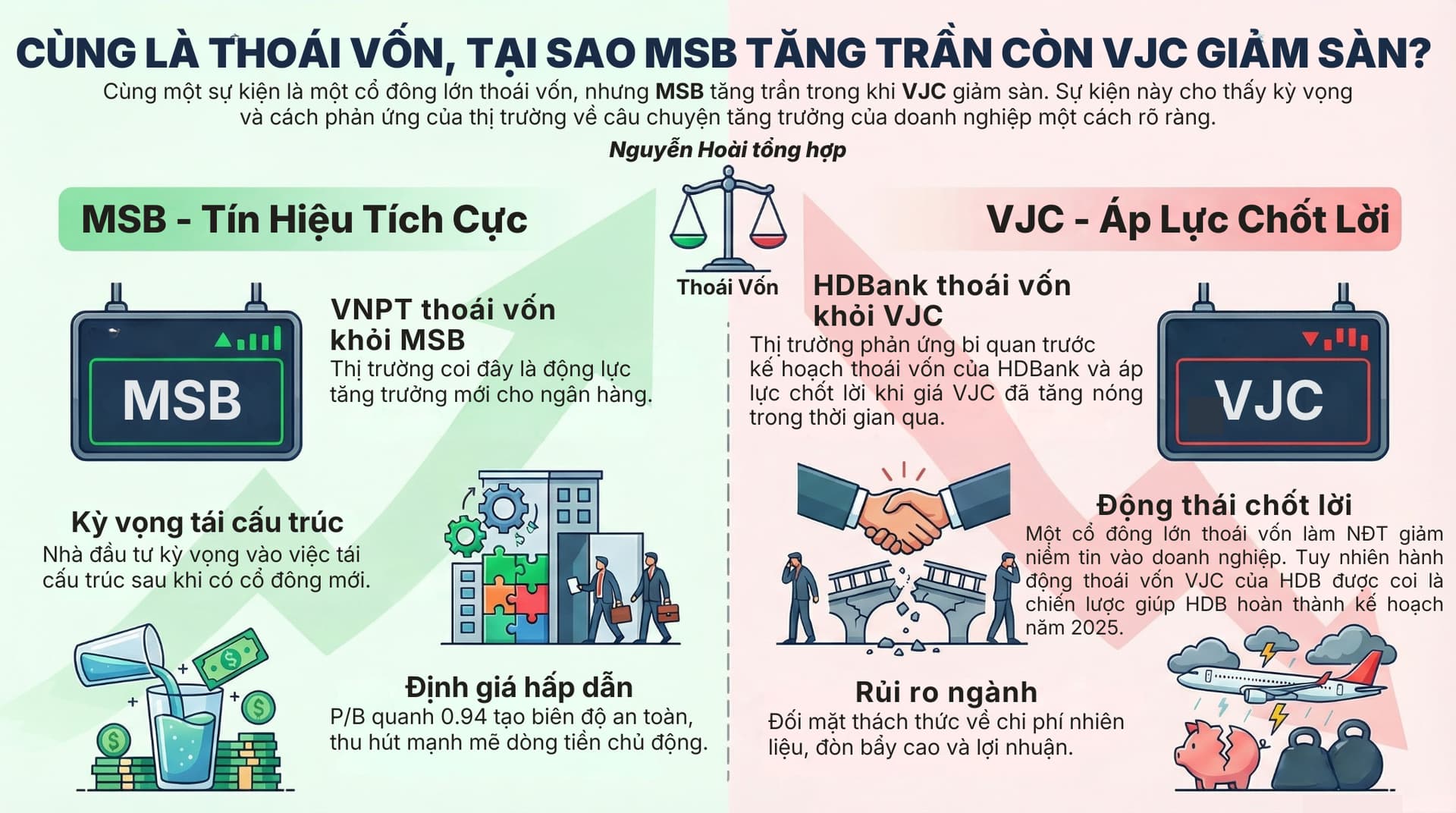 Phiên giao dịch hôm nay chứng kiến rõ rệt kỳ vọng của thị trường và câu chuyện tăng trưởng của VJC (giảm sàn) và MSB (tăng trần).