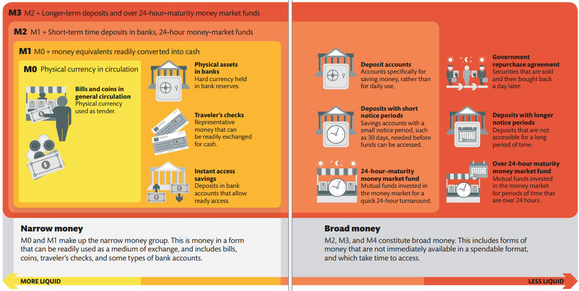 Các loại tiền tệ trong một nền kinh tế được phân loại thành các nhóm “M”. Hình thức tiền tệ dễ tiêu xài nhất, được gọi là tiền “hẹp”, và bao gồm các loại M0 và M1.