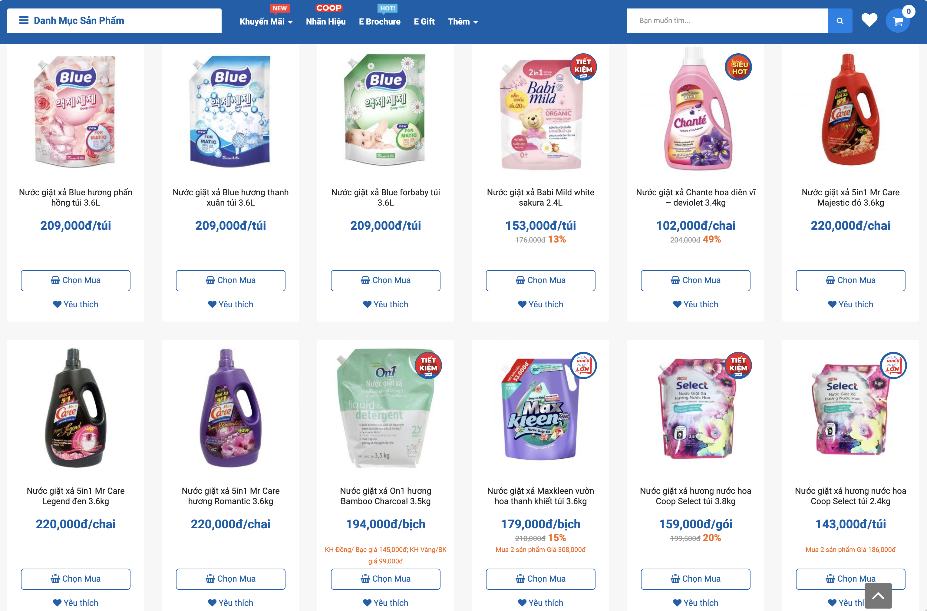 Các chương trình khuyến mãi nổi bật cụ thể, như "Lễ hội giặt xả - Mua nhiều giảm nhiều" giảm mạnh đến 35%, mua 2 tính tiền 1. Đặc biệt khi mua sản phẩm thứ 2, 4, 6,... chỉ còn từ 0 đồng cho mặt hàng giặt xả. Chẳng hạn; nước giặt Lix Matic nước hoa 3.6kg, nước tẩy Javel Lix 1 kg; nước giặt Lix nước hoa 3.6kg, nước giặt Comfort thiên nhiên thanh khiết túi 3kg, viên giặt Omo sương mai tinh khiết/hương tươi mát 315g, nước xả Comfort nước hoa thiên nhiên quyến rũ 3.2L...