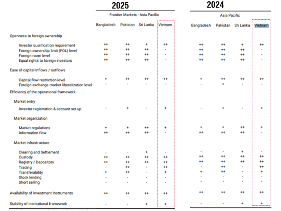 MSCI vừa công bố kết quả phân loại thị trường năm 2025, qua đó Việt Nam vẫn không có thay đổi thứ hạng, và thậm chí là không có bước tiến gì trong các tiêu chí đánh giá cụ thể trong 1 năm qua, bất kể những nỗ lực thay đổi trong thời gian gần đây. Cuối tuần mời cả nhà tham khảo bài viết của StockLine về diễn biến tiến trình Nâng hạng gần nhất nhé Tâm điểm Thị trường 20/06/2025 - TTCK Việt Nam không thay đổi nhiều từ đánh giá của MSCI