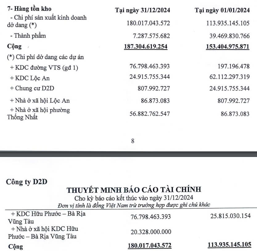 Thực tế, trong 9 tháng năm 2024, D2D đã đầu tư thêm 49,86 tỷ đồng vào Dự án Khu dân cư Lộc An, lên 111,97 tỷ đồng và vẫn trong giai đoạn tiếp tục đầu tư. Nhưng với quỹ tiền mặt chỉ còn 75,2 tỷ đồng, Công ty sẽ phải tìm giải pháp huy động vốn để bổ sung nguồn triển khai Dự án, cũng như các dự án nhà xưởng trong Khu công nghiệp châu Đức.