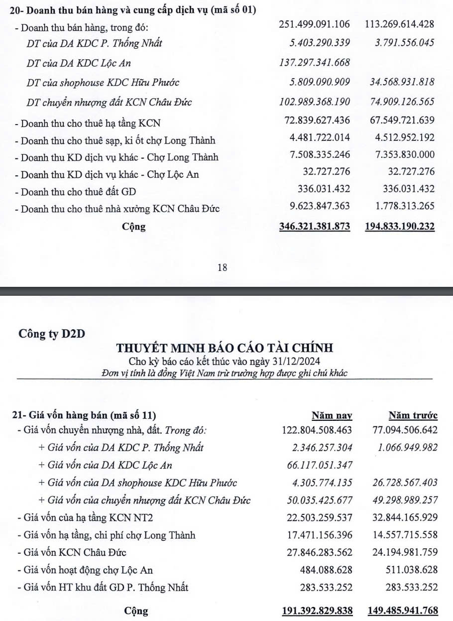 Để tìm động lực tăng trưởng, D2D đã đầu tư 6 nhà xưởng cho thuê tại Dự án Khu công nghiệp Châu Đức với tổng diện tích 47.996,3 m2, tổng vốn đầu tư 233,2 tỷ đồng và thời gian đầu tư từ tháng 2/2024 đến tháng 12/2026. Trong đó, Công ty ước tính doanh thu khoảng 1.429,3 tỷ đồng, lợi nhuận trước thuế dự kiến 1.177,1 tỷ đồng.