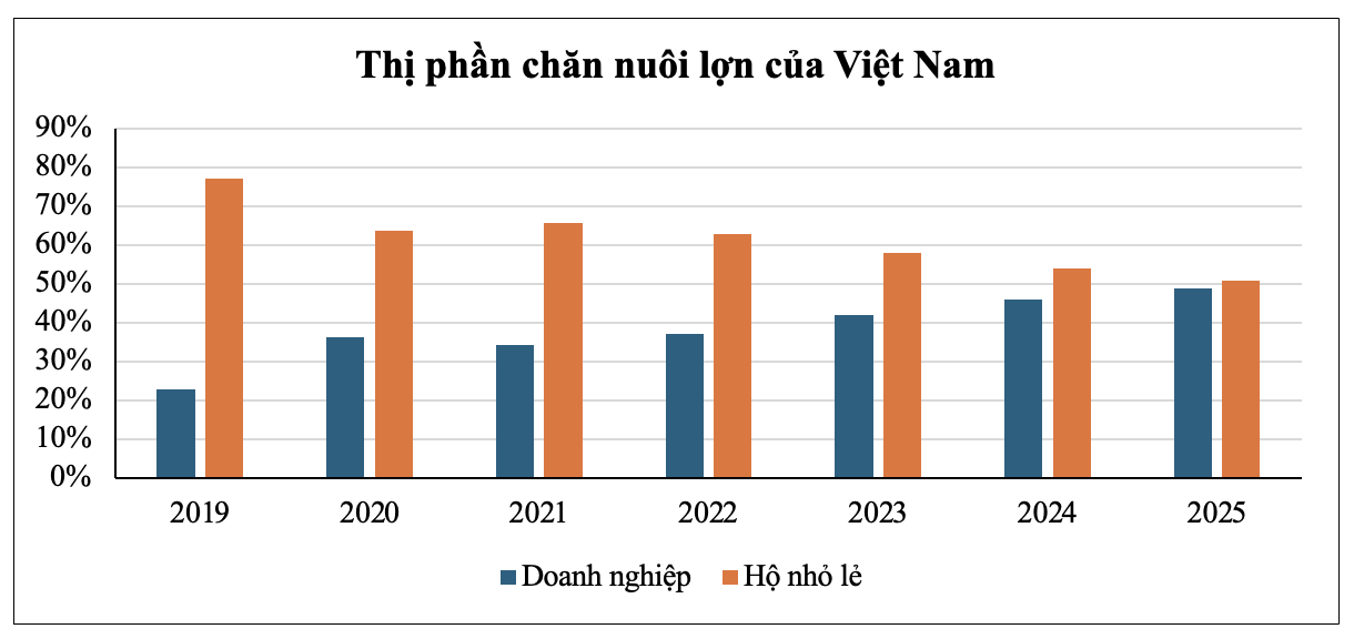 Ngành chăn nuôi Việt Nam đang chuyển dịch mạnh mẽ từ mô hình hộ nhỏ lẻ sang các doanh nghiệp quy mô lớn, phù hợp với xu hướng hiện đại hóa nông nghiệp. Theo số liệu mới nhất, thị phần chăn nuôi lợn của hộ nông dân đã giảm từ 70% về còn 49%. Nguyên nhân đến từ: