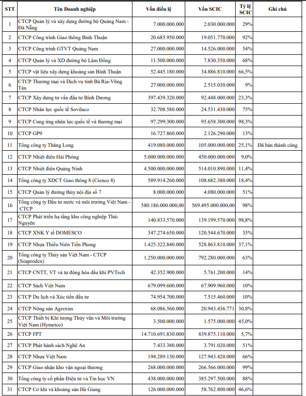 DANH SÁCH THOÁI VỐN ĐỢT 1/2025 CỦA SCIC