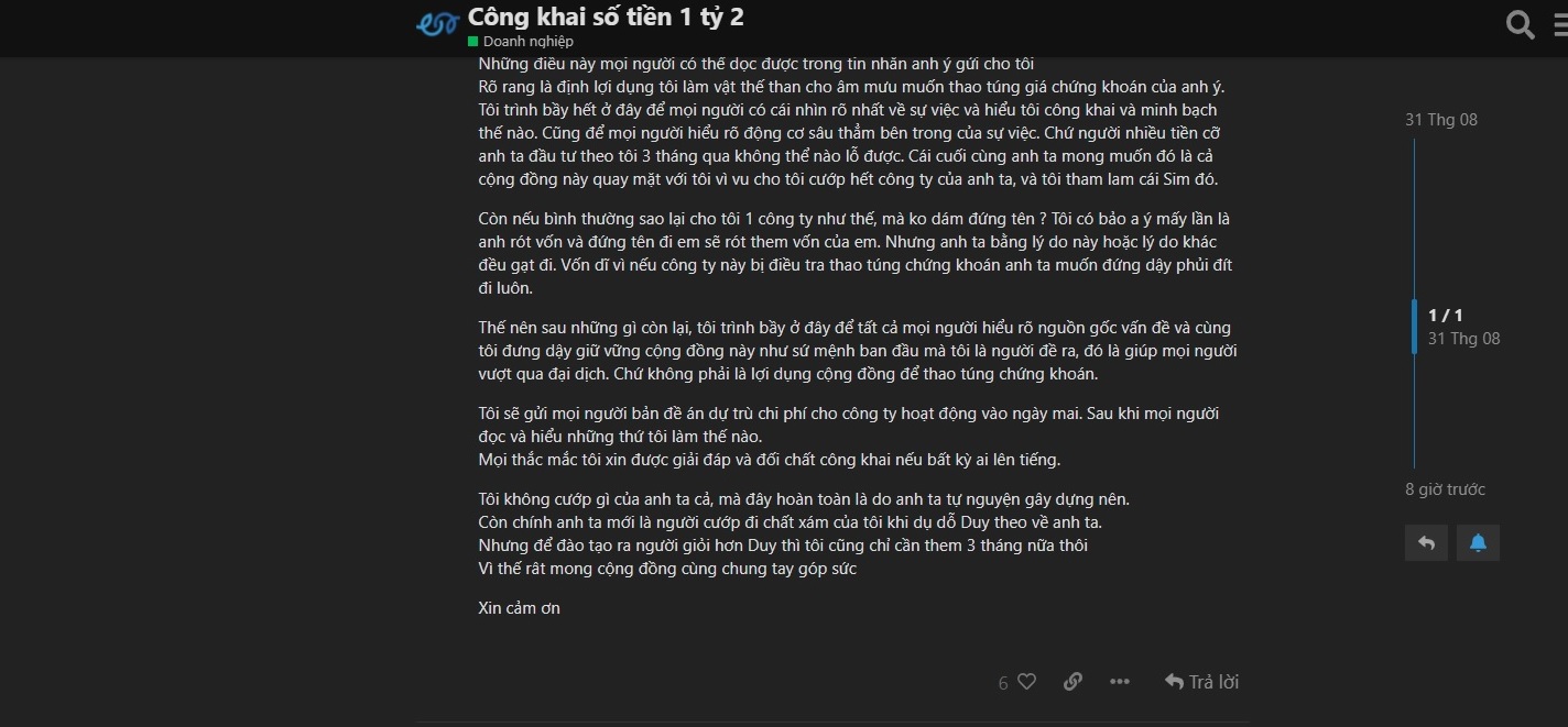 Nói thật là room tôi ăn nhiều. Người thua lỗ gần như không có. Anh chỉ nhau đầu tư chứ ko có cái kiểu khích bác này kia. Xưa cũng có một số và sau đó tôi cho mời ra. Thắng thua do bản thân mình học tập và rèn luyện cùng các chuyên gia chỉ dẫn để mở mang kiến thức và phát triển bản thân. Đầu tư có nhiều góc độ nhưng về cơ bản thì phải có cơ sở luận. Điều này chắc chắn room tôi rất rõ ràng. Tôi sẽ đưa ghim của tôi cho mọi người xem thử chứ ko có bàn kiểu cãi nhau.