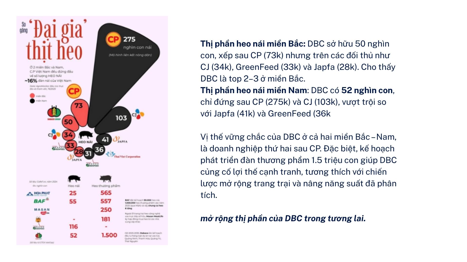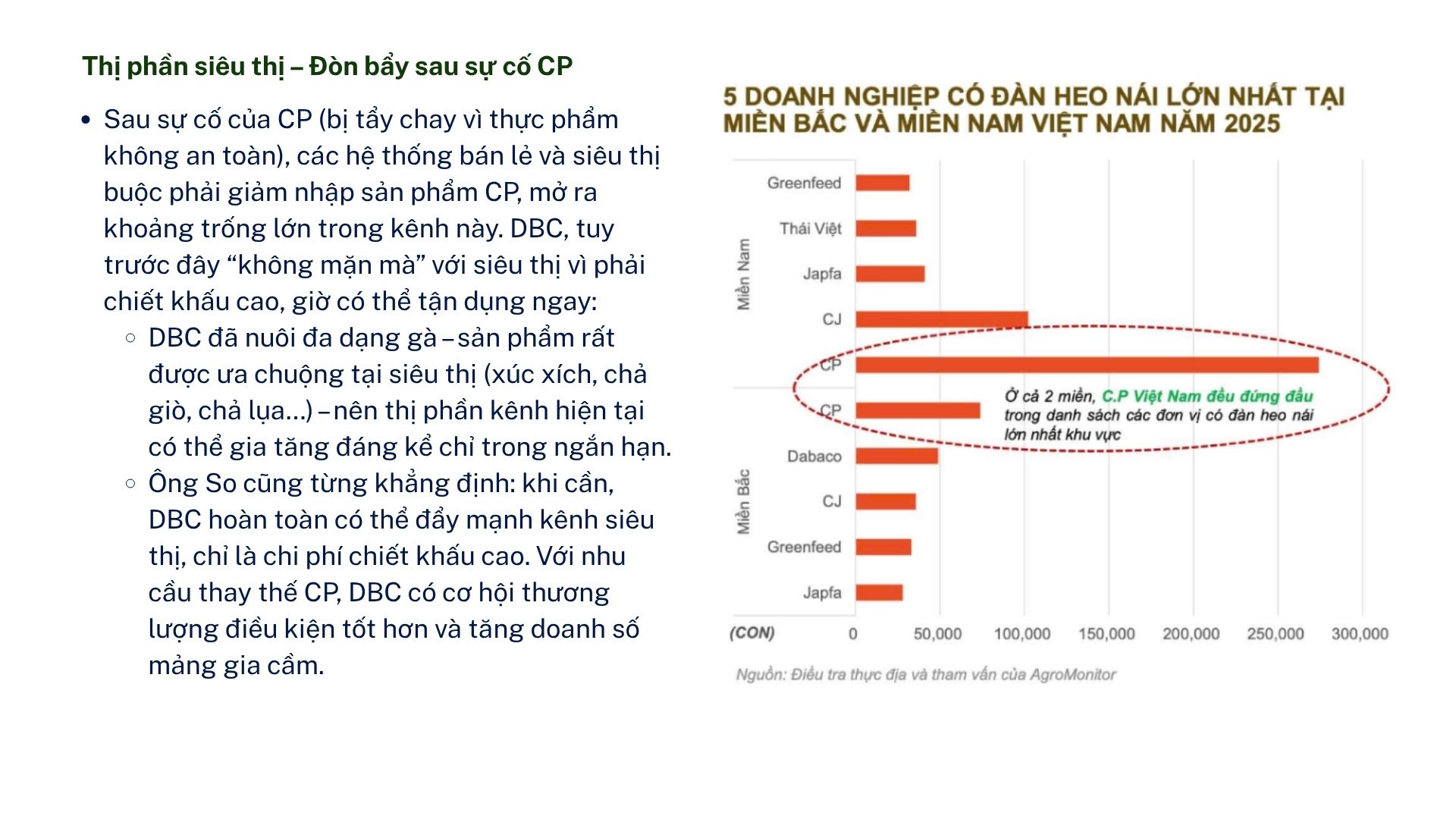 - Ông So cũng từng khẳng định: khi cần, DBC hoàn toàn có thể đẩy mạnh kênh siêu thị, chỉ là chi phí chiết khấu cao. Với nhu cầu thay thế CP, DBC có cơ hội thương lượng điều kiện tốt hơn và tăng doanh số mảng gia cầm.