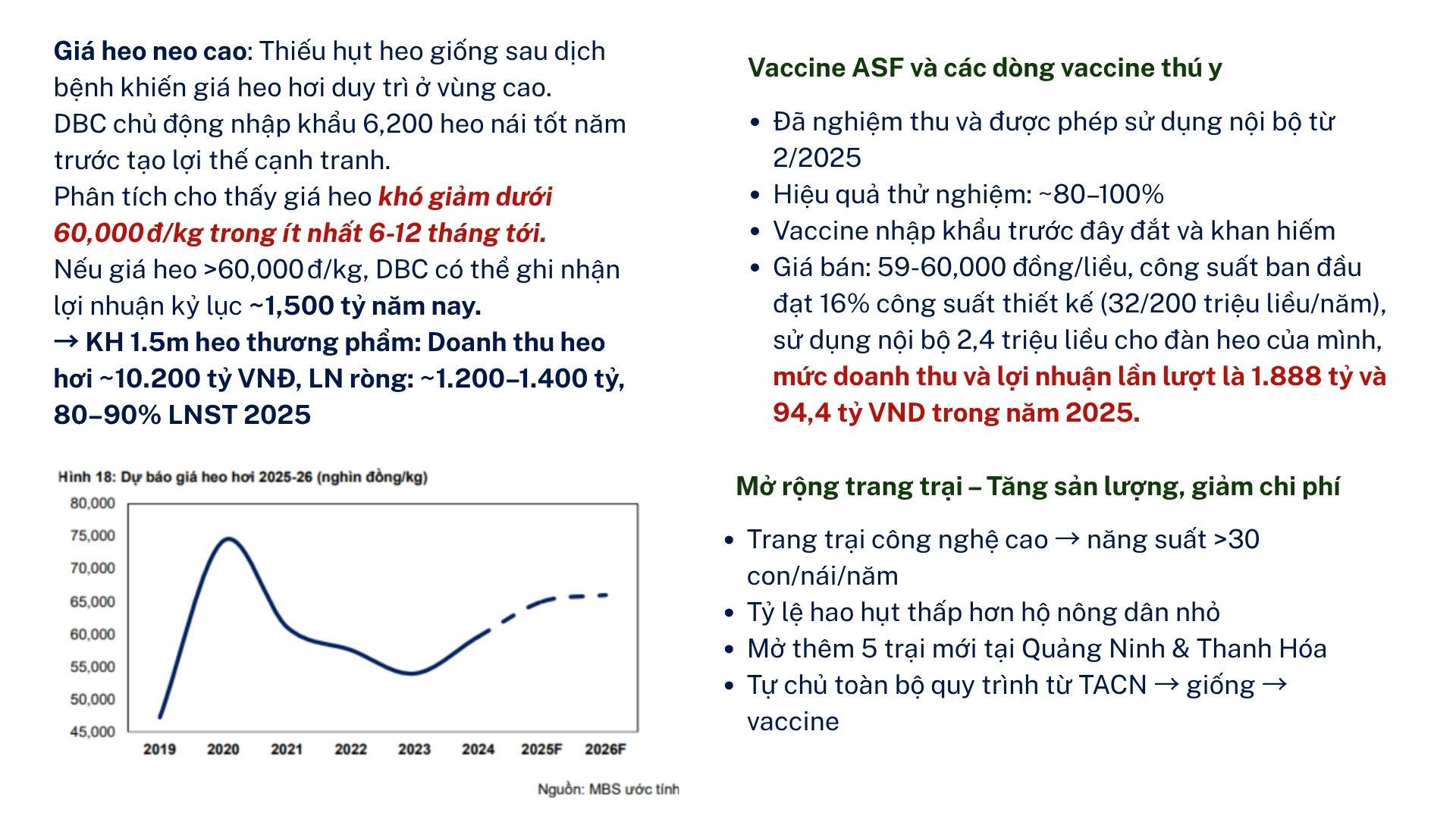 DBC có chữ N trong CANSLIM, đến từ mảng vaccine, trong kịch bản cơ sở (32 triệu liều): 94.4 tỷ VND, Nếu Philippines cấp phép xuất khẩu vào cuối 2025, DBC có thể tăng tốc tiêu thụ quốc tế vào 2026 → tiệm cận công suất cao hơn.