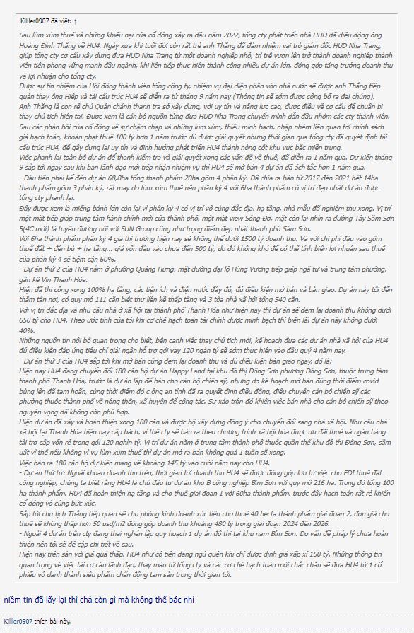 HU4 tiền lực khá, tài sản nhiều, quan hệ tốt, vấn đề là ở ăn chia , nếu cơ cấu ăn chia xòng phẳng, có anh Minh KTC vào ban KS đứng về phía cổ đông thì cũng giống L14, là một Game đáng mong đợi đấy, tiền và ts nhiều, chỉ ở vấn đề chia xòng phẳng thui