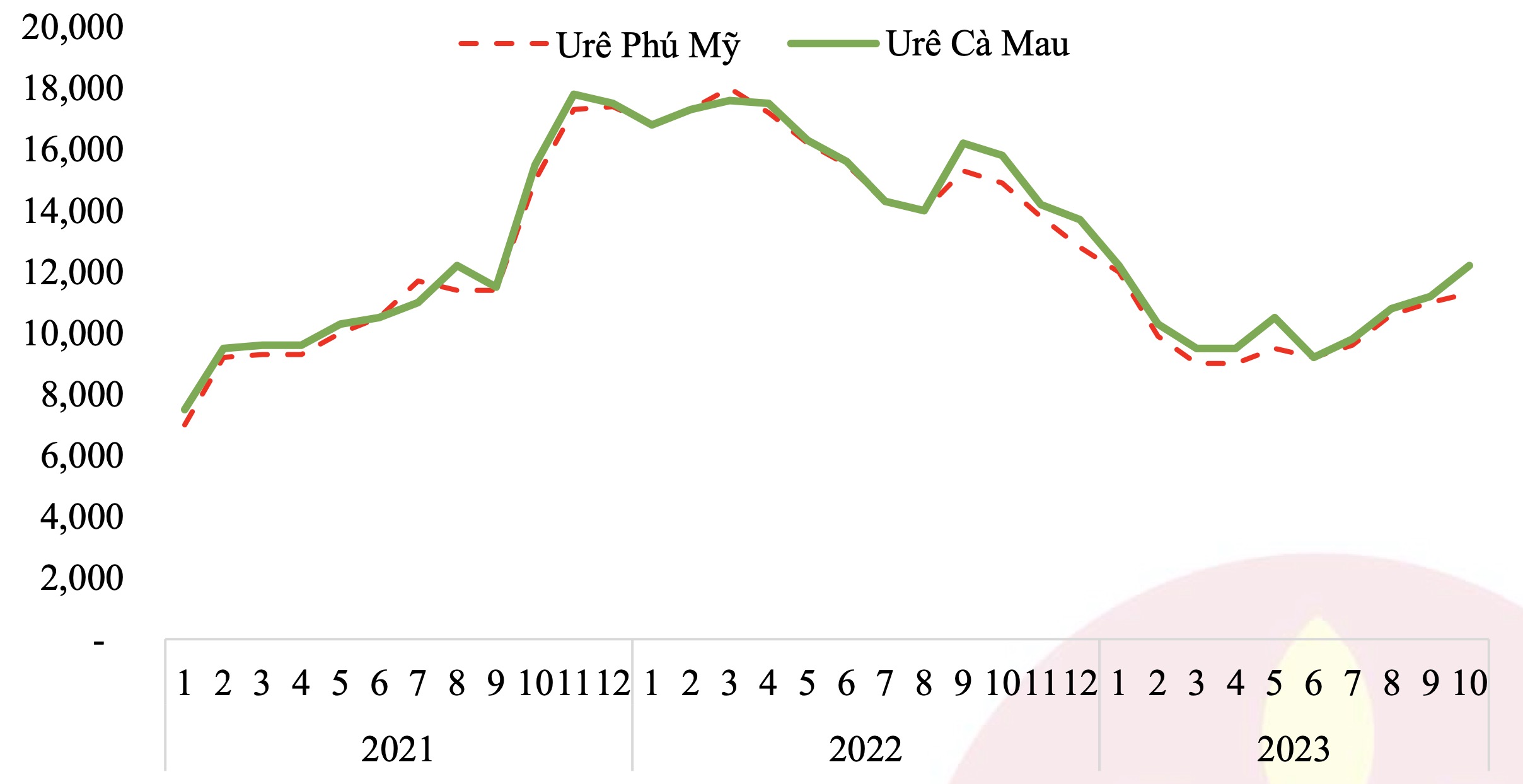 Diễn biến giá phân ure Phú Mỹ và Cà Mau. (Nguồn: Đạm Cà Mau)