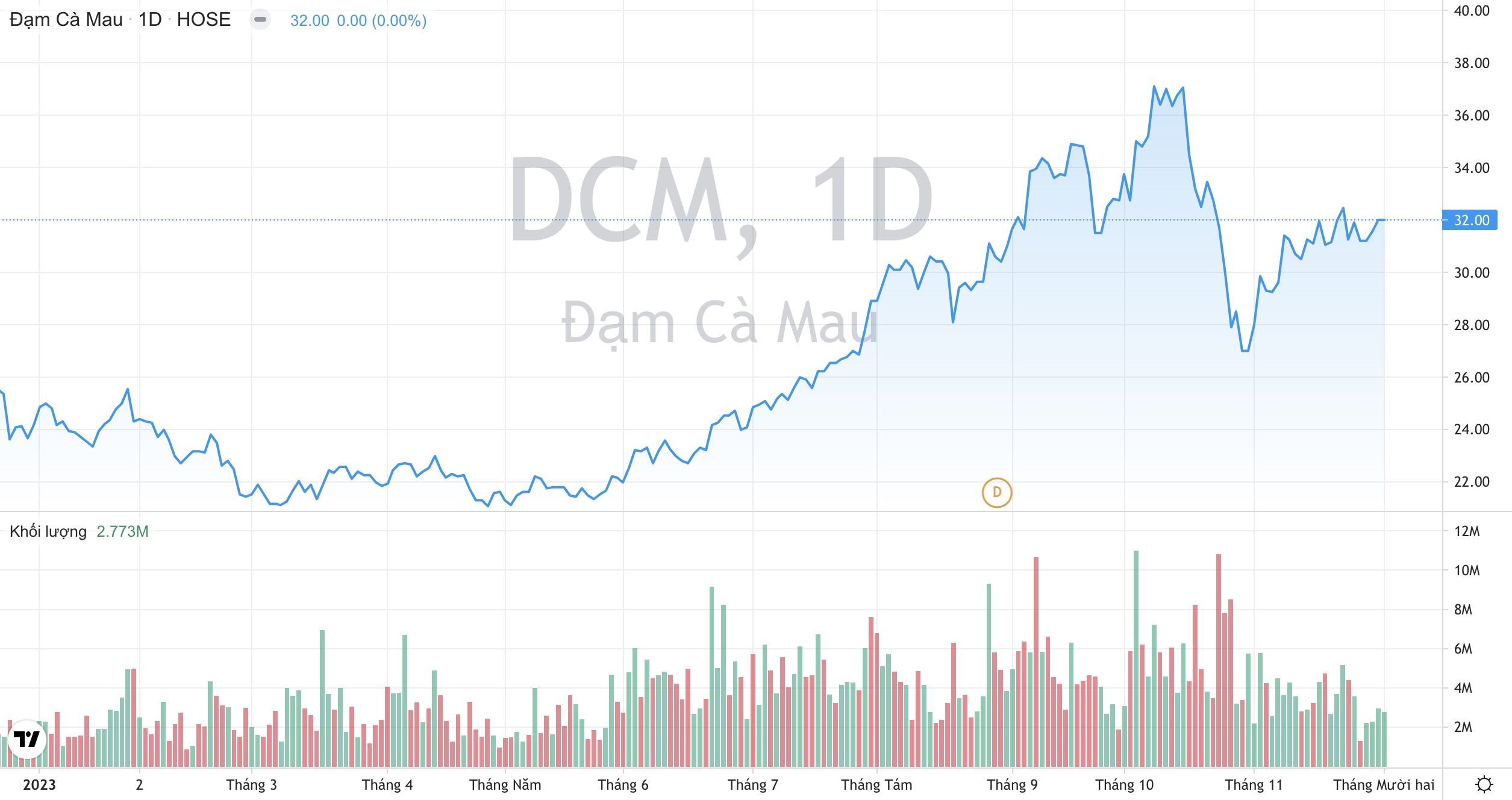 Khối lượng giao dịch và xu hướng giá cổ phiếu DCM của Đạm Cà Mau từ đầu năm 2023 đến nay.Ngoài ra, theo đánh giá của Maybank Investment Bank, Đạm Cà Mau có thể có yếu tố bất ngờ tích cực về mặt hạch toán lợi nhuận cho năm 2022 và năm 2023 khi giá khí đầu vào cho năm 2022 vẫn chưa được quyết toán xuất phát từ việc giá khí cho cả cụm PM3 - Cà Mau chưa được quyết toán. Với việc hạch toán ở mức thận trọng trong năm 2022, Đạm Cà Mau có thể ghi nhận hoàn nhập dự phòng trong thời gian tới.