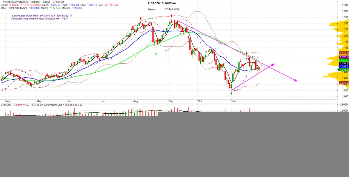 Thị trường kết phiên ngày 27/11 với mức giảm -7.55 điểm (-0.69%) và đóng cửa tại mốc 1088.06 điểm. Thanh khoản khớp lệnh giao dịch là 9977 tỷ, chưa đến 10000 tỷ, phiên giao dịch thấp nhất trong 1 tháng qua. Phiên gần nhất có mức thanh khoản bé hơn là 30/10/2023.