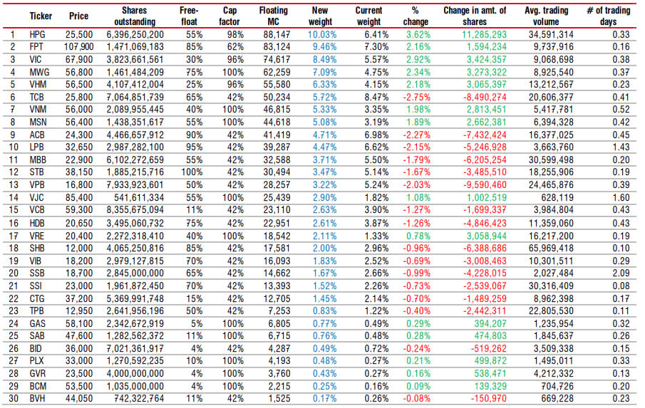 Ngoài ra ngày 16/04 vừa qua HSX cũng công bố quy tắc xây dựng và quản lý bộ chỉ số Hose phiên bản 4.0 thay thế cho phiên bản 3.1, có hiệu lực đánh giá từ ngày 28/4/2025. Theo đó bộ quy tắc mới sẽ có năm thay đổi chính với điều kiện sàng lọc chặt chẽ hơn. Đặc biệt việc áp dụng mức giới hạn tỷ trọng 40% vốn hóa trong một ngành sẽ khiến nhóm Ngân hàng chịu áp lực đáng kể do nhóm ngành này đang chiếm tỷ trọng 57% trong bộ chỉ số. Dự kiến trong kỳ cơ cấu ETF lần này VPB, TCB, ACB, SHB, MBB bị bán ra, ngược lại các quỹ ETF tracking Vn30 mua vào HPG, VIC và MWG.
