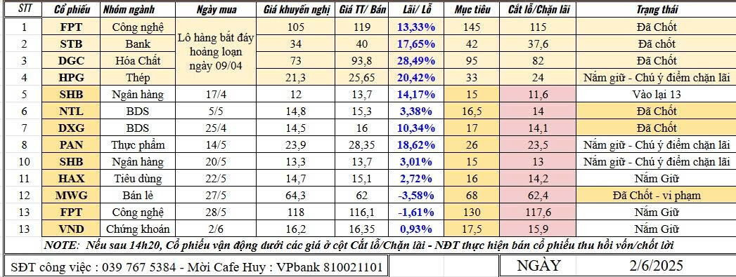 • Tuần qua chúng ta đã chốt lời một số cổ phiếu ở vùng cao này của TT - Chi tiết các cổ phiếu còn lại theo Bảng danh mục đã phần Bank, TCH MWG – Trạng thái hiện tại là nắm giữ chờ bán anh chị nhé – Khi nào bán Nam sẽ cập nhật gửi đến anh chị trong Room