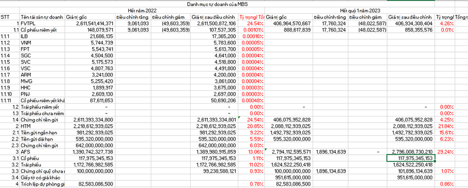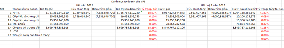 -Nhìn chung thì việc công ty không công bố cụ thể thông tin cổ phiếu nắm giữ trong quý 1/2023 nên hơi khó để nhận định, nhưng theo những thông tin có được từ báo cáo tài chính thì có thể thấy là VND ưu tiên sự an toàn trong hoạt động tự doanh khi mà trái phiếu và chứng chỉ tiền gửi ít có sự điều chỉnh tăng giá so với cổ phiếu, bù lại thì danh mục có tỷ trọng cổ phiếu ít hơn cũng sẽ giảm cơ hội có lợi nhuận và tính thanh khoản cũng thấp hơn.