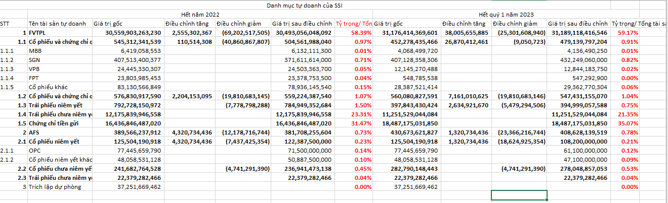 -Về danh mục tự doanh của SSI thì có thể thấy là công ty cũng tập trung nhiều hơn vào tính an toàn khi nắm giữ nhiều trái phiếu và chứng chỉ tiền gửi. Ở mảng cổ phiếu niêm yết trên sàn chính thì dù cho cuối năm 2022 có sự điều chỉnh giảm giá trị giữa giá gốc và giá trị thị trường nhưng đã có sự tăng lãi trở lại vào quý 1 năm 2023. Trong đó ngoại trừ FPT thì các cổ phiếu còn lại đều có sự tăng giá trị so với giá gốc. Đây cũng là lý do vì sao SSI đứng đầu trong nhóm 10 công ty chứng khoán có tự doanh lãi nhất quý 1 năm 2023 theo 1 thống kế của trang thông tin Vietstock. (Soi danh mục của top 10 công ty chứng khoán lãi tự doanh đậm nhất quý 1 | Vietstock )